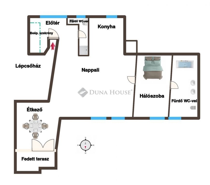 66 nm-es, fedett teraszos, belső kertre néző gyönyörű Otthon egy kevés lakásos, zárt lakóparkban található.
