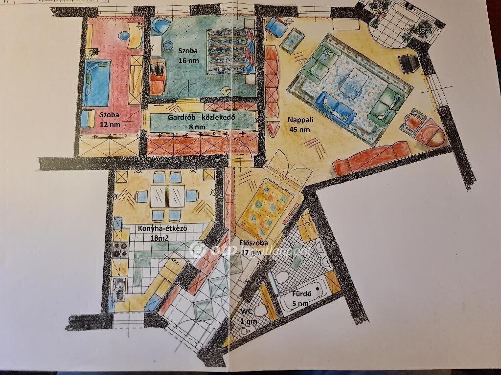 A közös költség 27.000 Ft havonta. A lakás riasztóval felszerelt. A vételár részét képezik a beépített szekrények és a konyhabútor, nagy értékű csillárok, falikarok, függönyök, redőnyök és spaletták, valamint egy 6,5 négyzetméteres, polcokkal felszerelt, zárható tároló a pinceszinten. A lakás teljes berendezése külön megállapodás tárgyát képezheti.