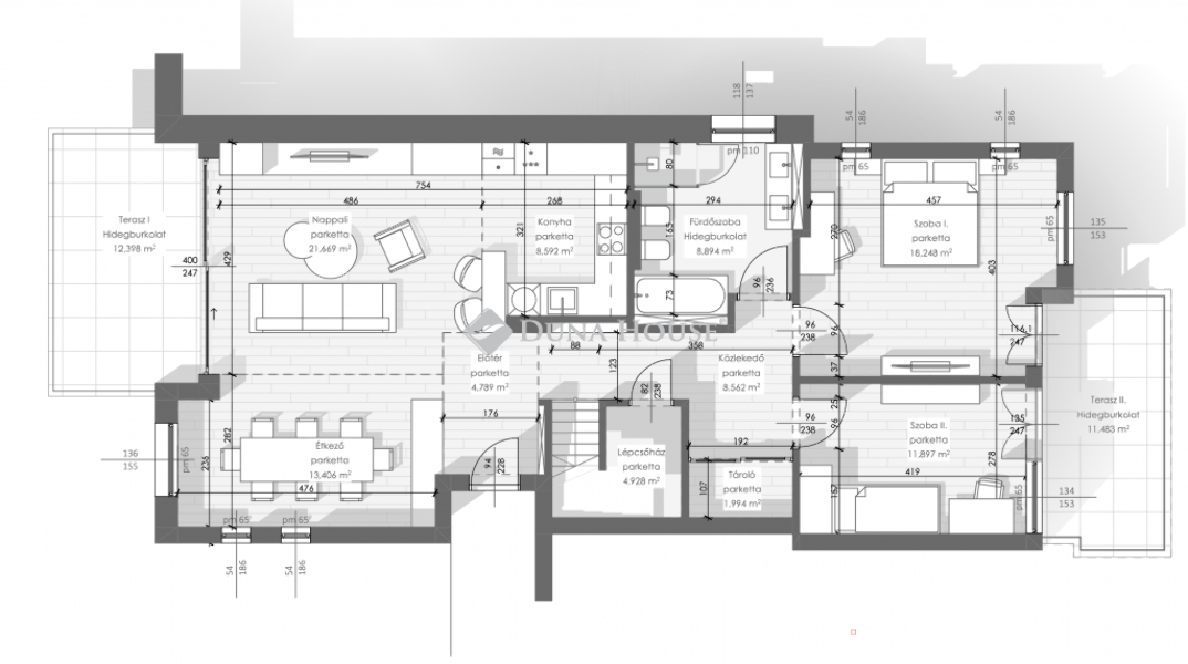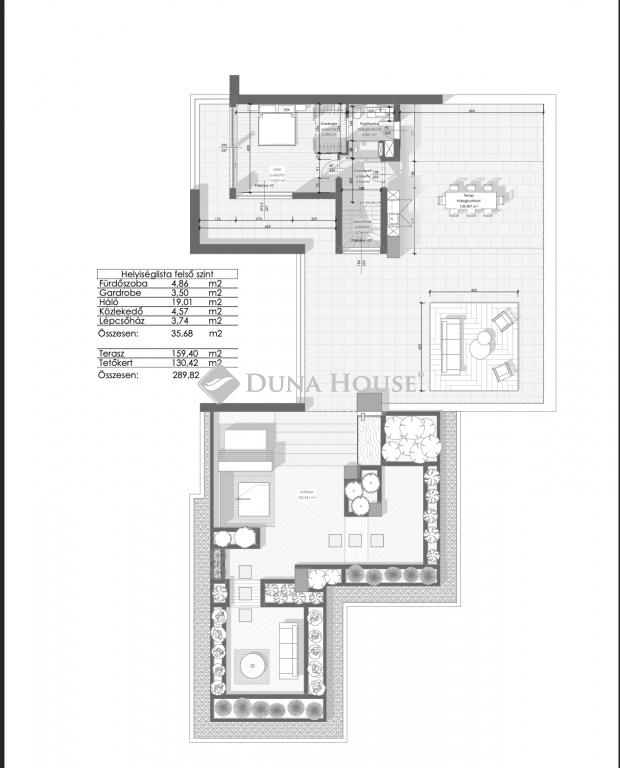 Tetőterasz: több mint 300 m², egyedülálló kilátással a Budai-hegyekre. Kialakítása lehetővé teszi jakuzzi, szauna vagy akár egy privát konditerem elhelyezését, így a tökéletes otthoni wellness és fitness megteremthető.