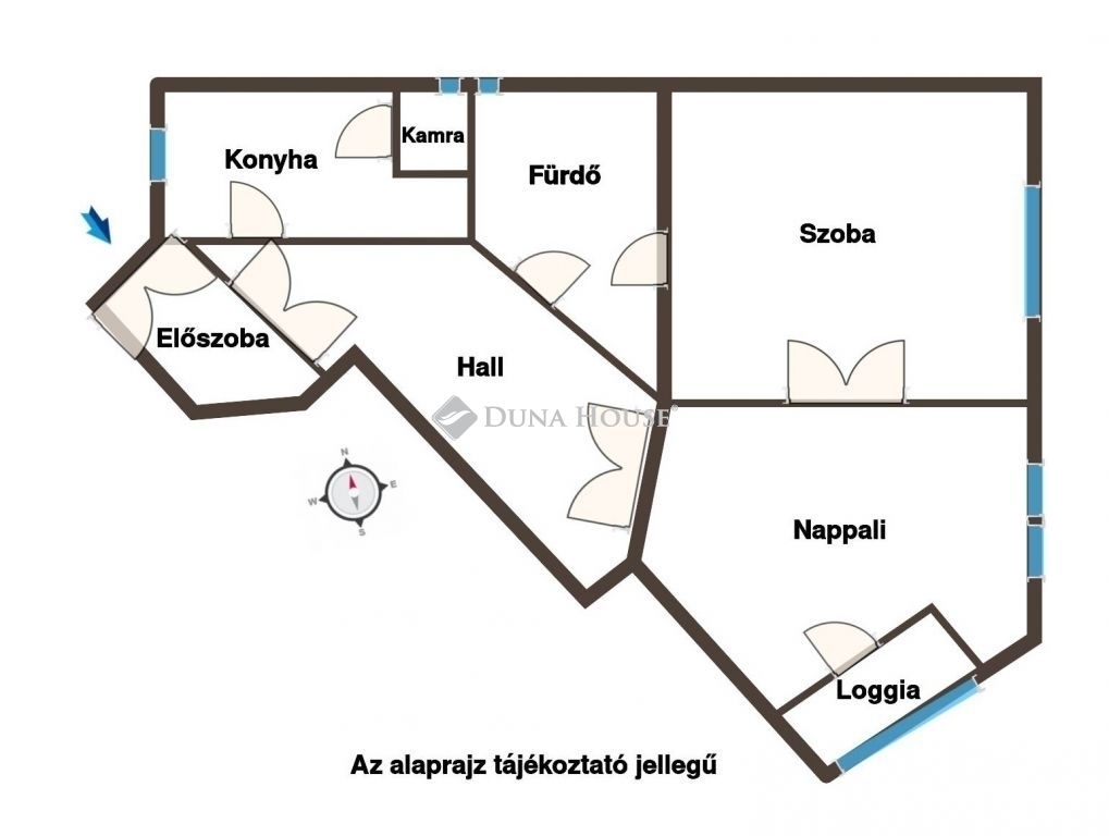 A praktikus alaprajzú, világos otthon két nagy méretű szobával, hallal, kamrás konyhával, fürdőszobával, beépített loggiával és előszobával rendelkezik..