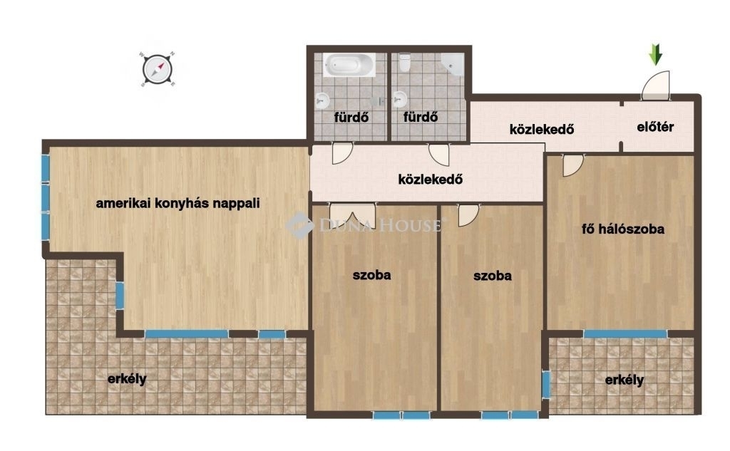 - 2 fürdőszoba (egyikben kád, másikban zuhanyzó)