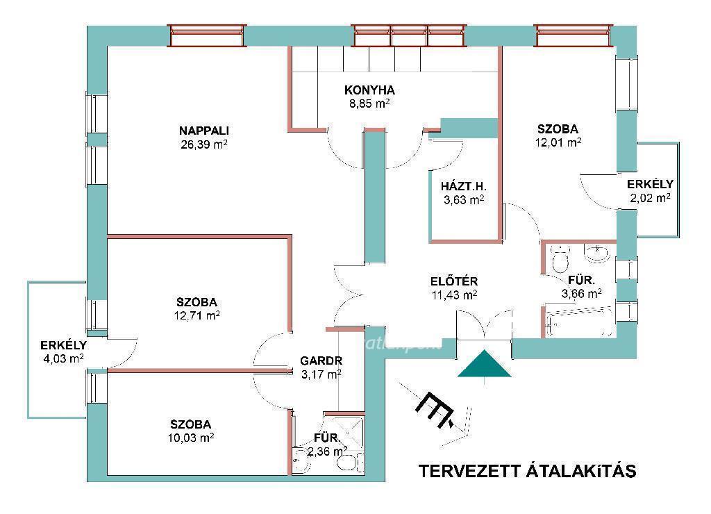 Az engedélyezett nyílásokat, és a lehetséges négy szoba kialakítását a mellékelt tervezett alaprajzon pirossal jelöltük.