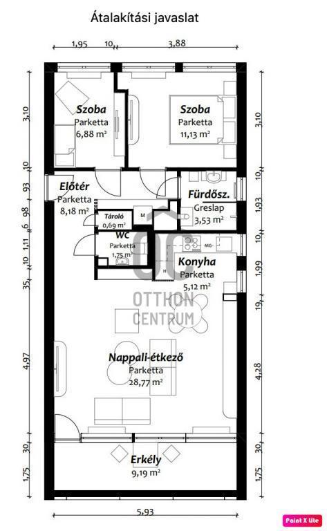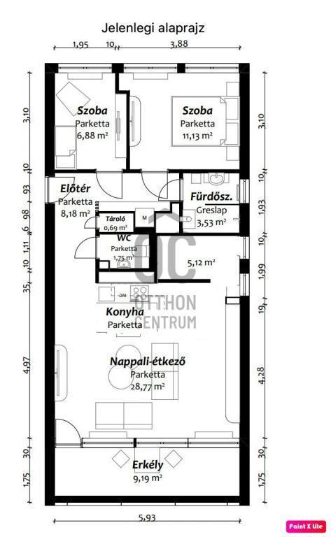 - Két külön nyíló hálószoba (11,13 m² és 6,88 m²)