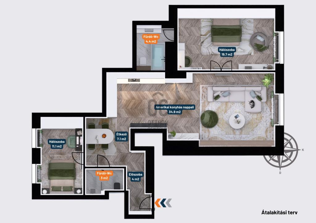 Tájolása keleti, hatalmas ablakokkal és világos terekkel rendelkezik.