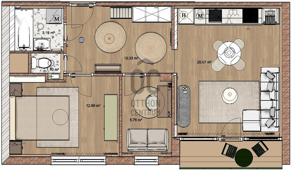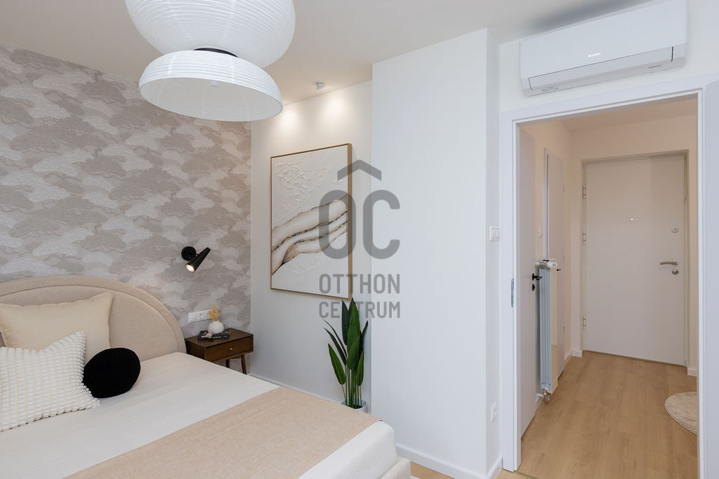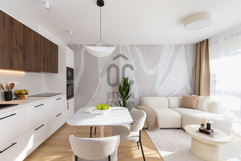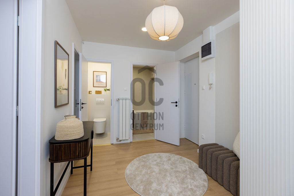 A belső kialakításnál a funkcionalitás, minőség és az esztétikum egyensúlya volt a fő szempont - letisztult anyaghasználat, magas minőségű burkolatok és jól megtervezett térkapcsolatok teszik élhetővé és időtállóvá az otthont. A lakás alaprajza a modern városi élethez hangolt.