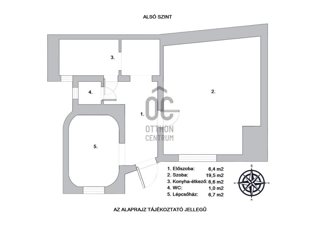 - Az alsó szint felosztása: előszoba, szoba, konyha-étkező, WC-kézmosó, lépcsőház.