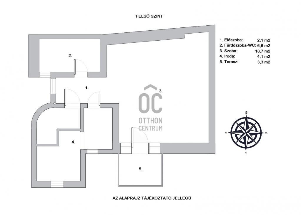 - A felső szinten, a lépcső fölött található egy jelenleg irodának használt, két részre osztott, ablakos helyiség.