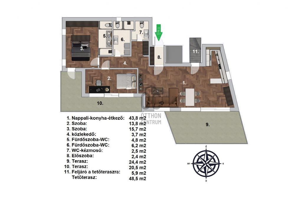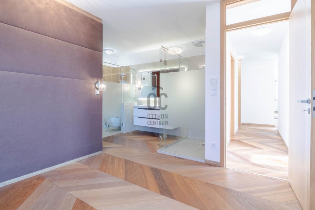 - 2. emeleti, 96 m2-es, 44,9 m2 terasszal és 48,5 m2 panorámás tetőterasszal rendelkező, luxus minőségű penthouse lakás.