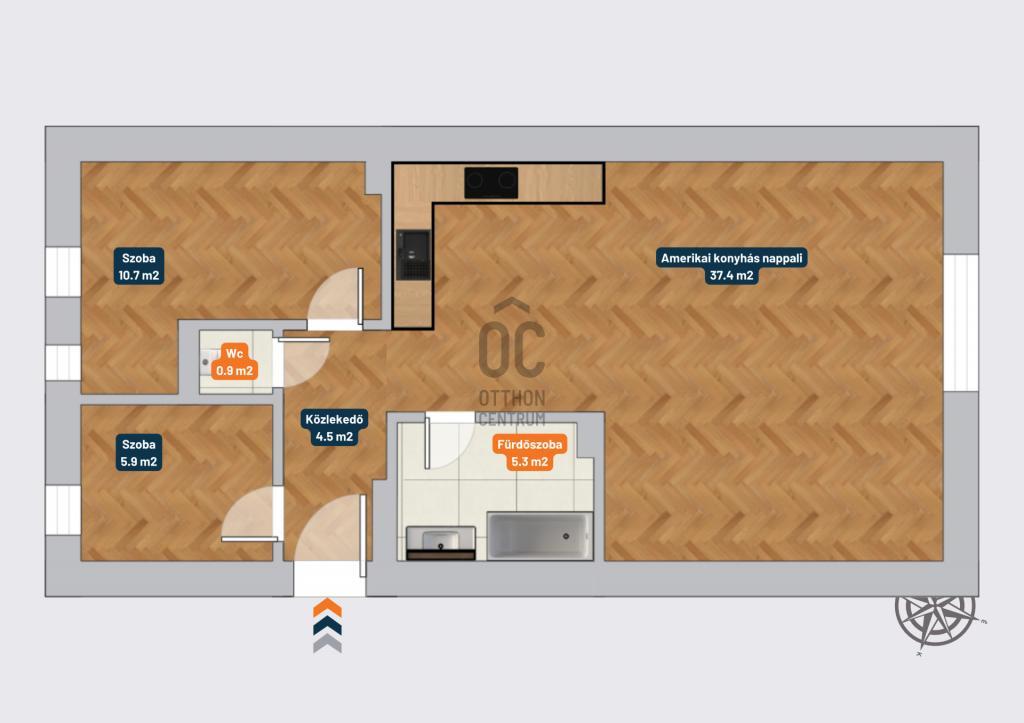 Jelenlegi felosztása: közlekedő, 2 szoba, amerikai konyhás nappali, fürdőszoba, külön wc.