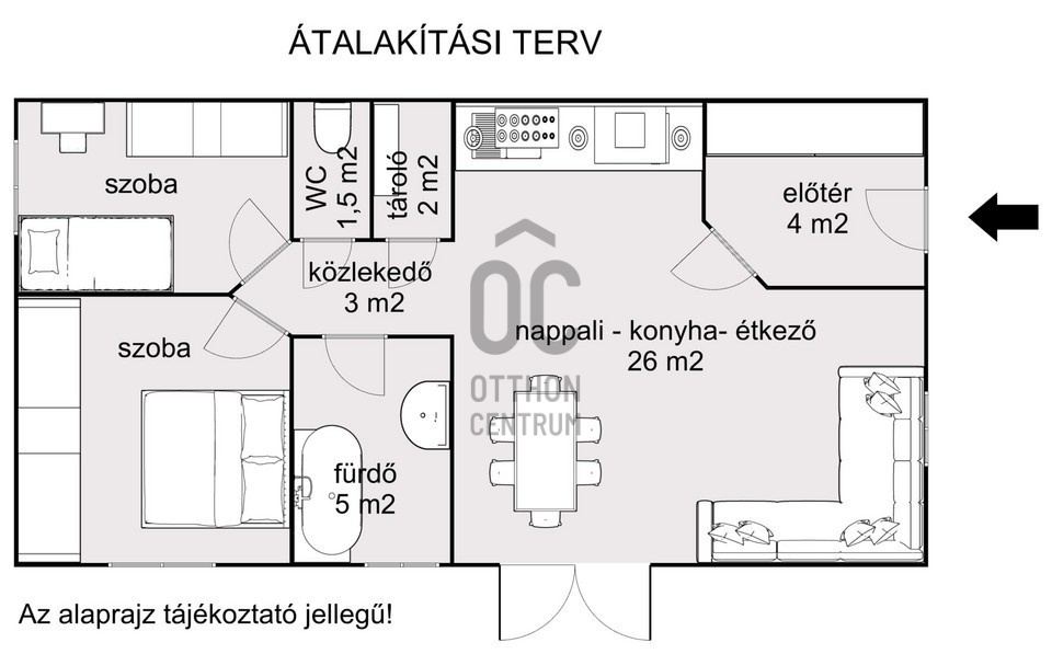 - Amerikai konyhás tágas nappali (26 m2) + nagy hálószoba (akár 2 szobássá alakítható)