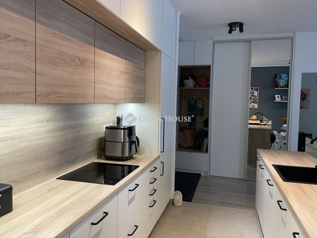 A lakás jól átgondolt elrendezésű: két külön nyíló hálószoba mellett egy tágas, amerikai konyhás nappali szolgálja a kényelmet. A fürdőszoba kádas kialakítású, a WC külön helyiségben található, ami szintén növeli a praktikusságot. A beépített konyhabútor a gépekkel együtt a lakás része marad, így a költözés után azonnal használatba vehető.