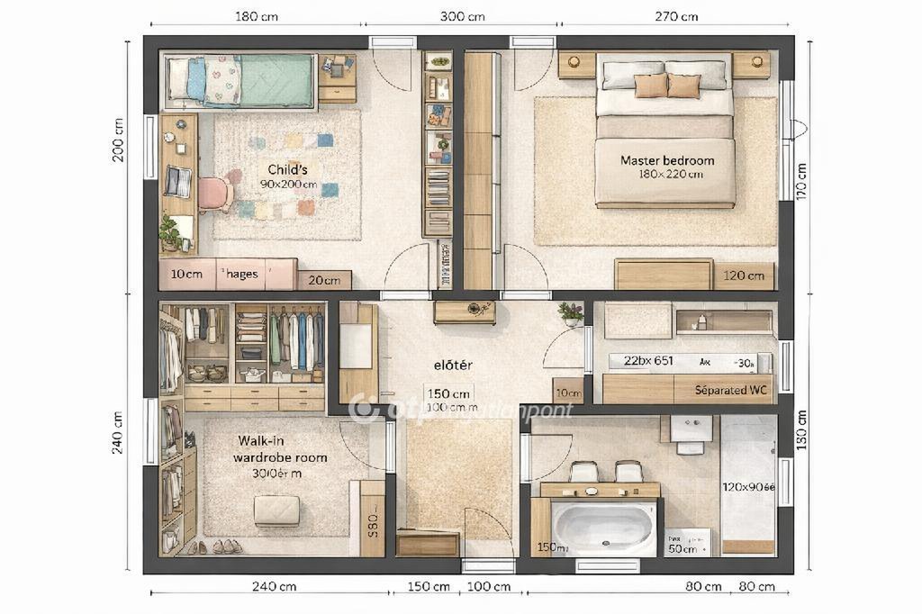 közlekedő, 2 hálószoba, gardrób, fürdőszoba káddal, WC