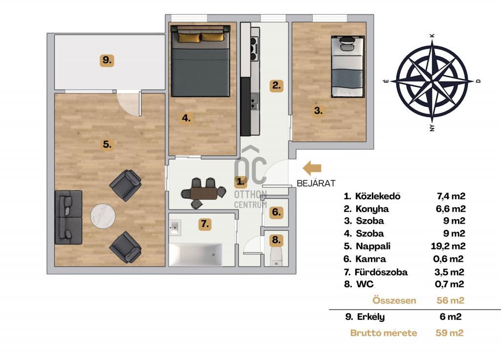 Jelenlegi elosztása: előszoba, konyha, kamra, erkélyes nappali, 2 hálószoba, fürdőszoba, külön WC.