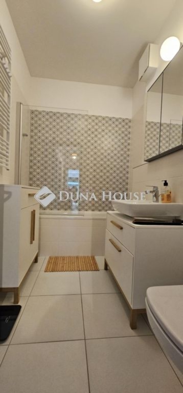 A lakás elrendezése: tágas, amerikai konyhás nappali étkezővel (34 nm), 2 hálószoba (13 nm + 12 nm), modern fürdőszoba káddal és WC-vel, külön WC. A konyha teljesen gépesített (beépített mosogatógép, hűtő, sütő), a lakás részben bútorozva eladó (étkezőasztal, székek, kanapé, szekrény). Minden szobában redőny található (távirányítós), a mennyezeti hűtés-fűtést pedig egy klíma egészíti ki.