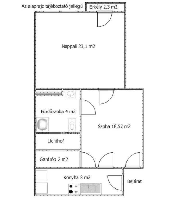 HELYISÉGEI: nappali 23,1 m2, szoba 18,57 m2, konyha 8 m2, sarokkádas fürdőszoba 4 m2, gardrób/kamra 2 m2, valamint az erkély 2,3 m2-es.