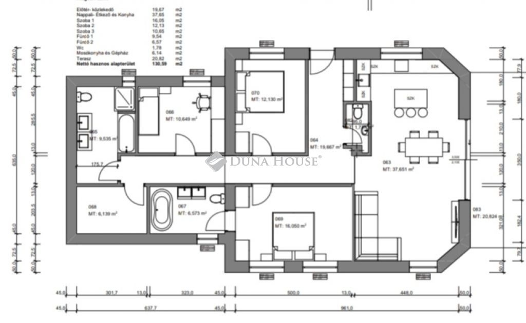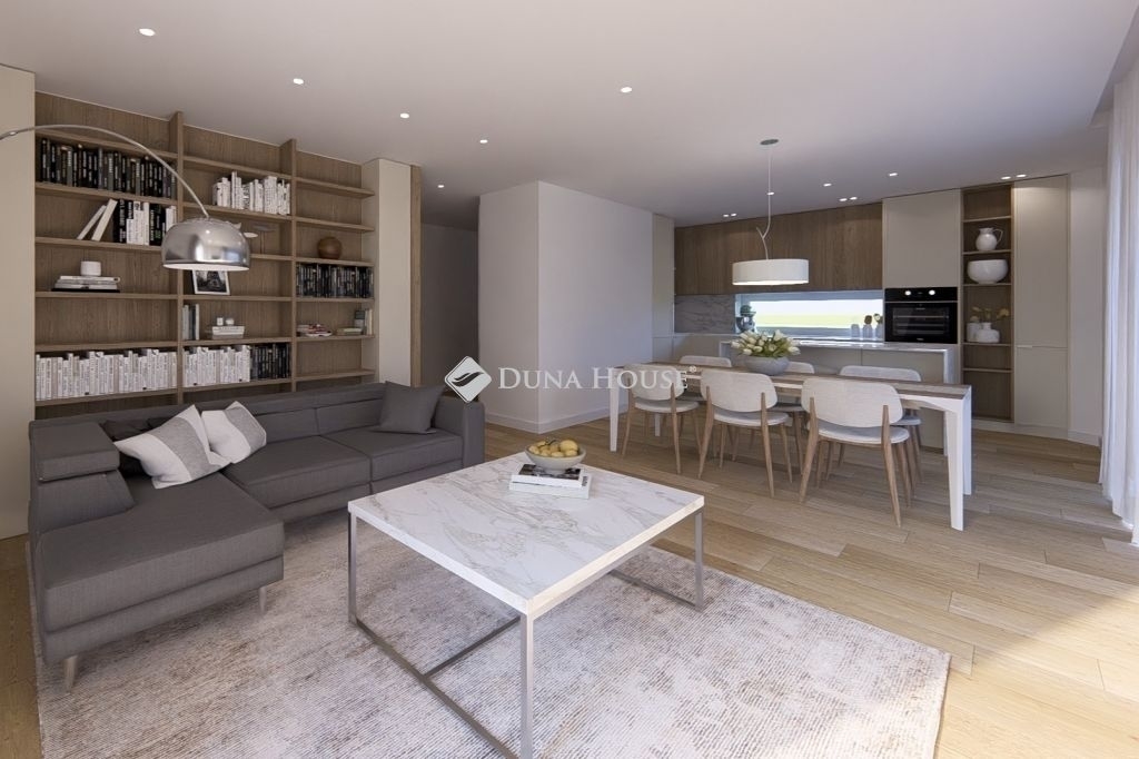 Az ingatlan az alábbi helyiségekből áll: panorámás nappali + konyha, 3 szoba, előszoba, 2 db fürdő +wc, lépcsőtér, erkély, háztartási helyiség.