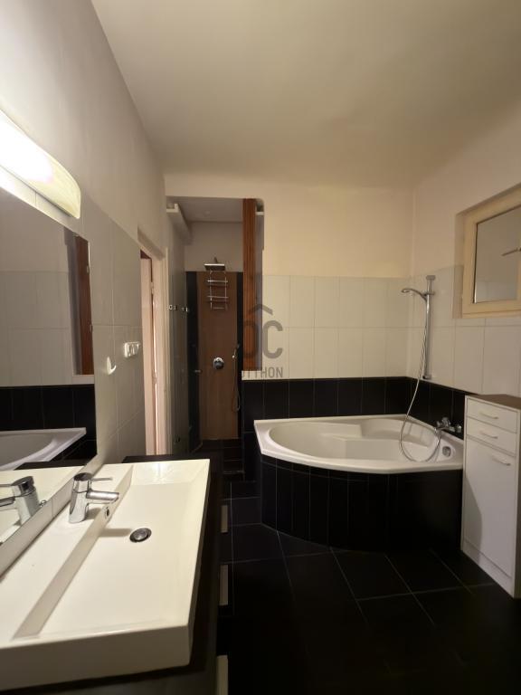 A tágas fürdőszoba káddal és zuhanyzóval is felszerelt, emellett egy külön kazánhelyiség-mosdó segíti a család reggeli készülődését.