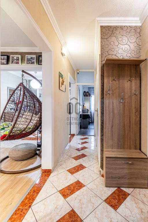 A gardróbszoba és a beépített szekrények bőséges tárolóhelyet biztosítanak, a külön fürdő és WC praktikus megoldás a mindennapokban.