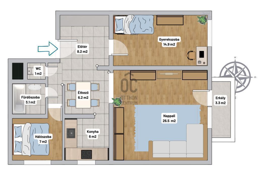 - A nappali tájolása déli, a lakás világos és logikusan bútorozható terekkel rendelkezik.