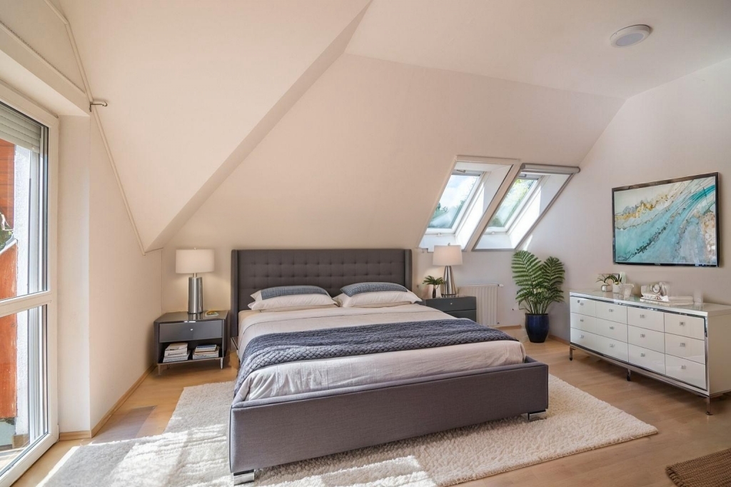 A lakás egy 2000-es évek elején épült, mindössze 5 épületből álló, kétszintes társasház első emeletén található, Dunai panorámával és egy 10 m²-es privát terasszal, amely a zöld kertre és a környező ősfás tájra nyújt kilátást.