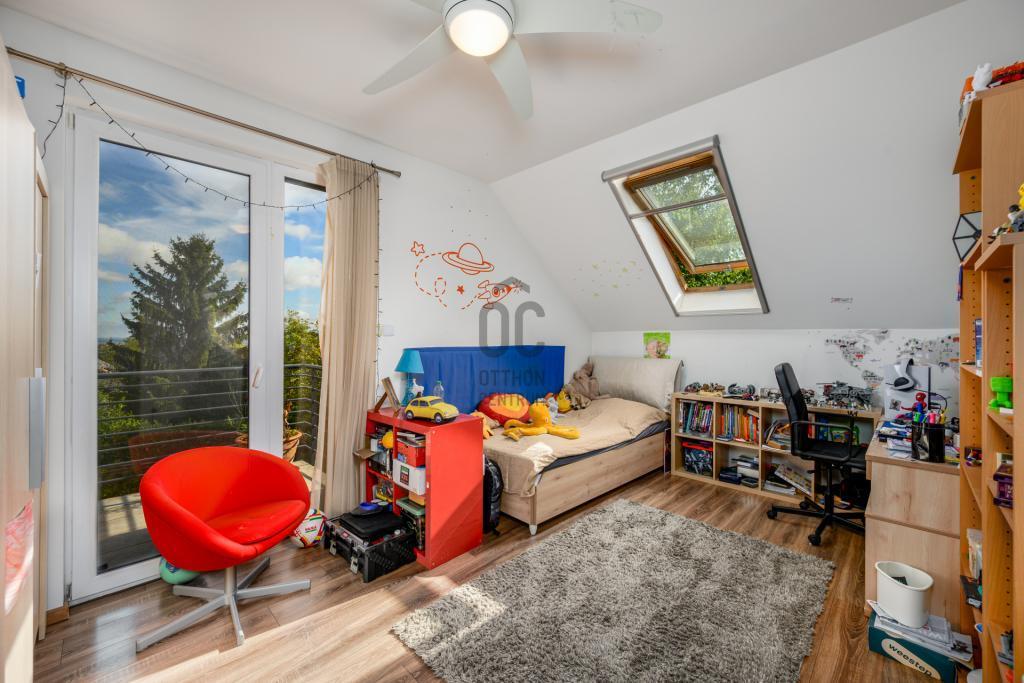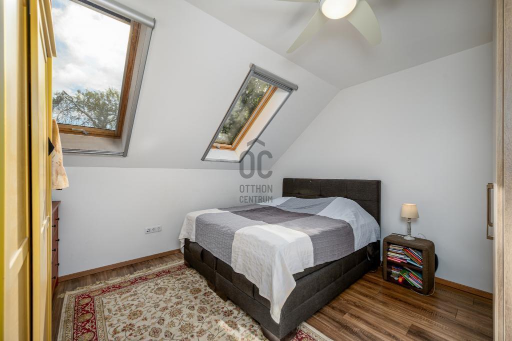 Emelet: 3 hálószoba, tároló, fürdőszoba sarokkáddal és WC-vel, panorámás erkély