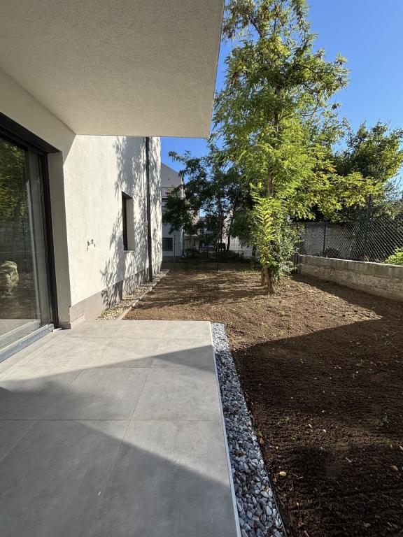 A lakáshoz tartozik egy 13 m²-es tágas terasz, egy saját, elkerített kertrész, valamint a terem garázsban egy beállóhely és egy önálló, zárható tároló.