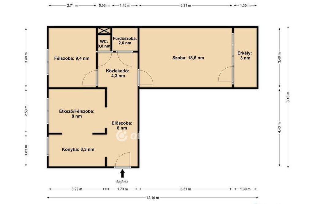 - 53 m² alapterület, 2 külön nyíló szoba, erkély