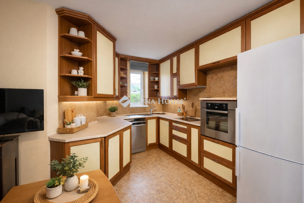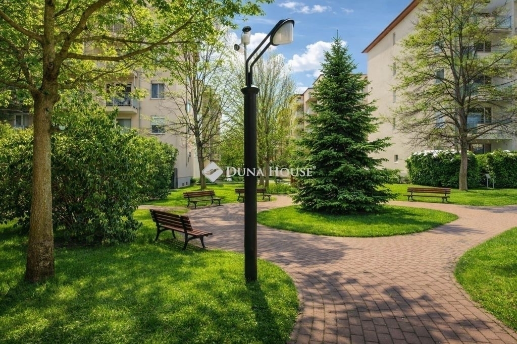 Napfényes, erkélyes otthon a Juharliget lakóparkban saját udvari gépkocsibeállóvalÚjpest egyik legkedveltebb, zárt lakóparkjában, a Juharligetben adunk el egy I. emeleti, 65 m²-es, amerikai konyhás nappali + 2 külön nyíló hálószobás, kiváló elrendezésű lakást.Az ingatlan belső tereit lakberendező tervei alapján alakították ki, az eredeti alaprajzot átgondoltan módosították. A vizes helyiségek kivételével parafa burkolat teremti meg a meleg, otthonos hangulatot. A keleti fekvésű hálószobák és a déli tájolású nappali miatt a lakást egész nap természetes fény járja át, télen is körbesüti a nap.A nappaliból egy 4,5 m²-es erkély nyílik, amely ideális pihenésre. A különleges hangulatú, üvegtéglával áttört falú, kádas fürdőszoba természetes fényt kap, emellett külön WC kis mosdóval biztosítja a mindennapi kényelmet. A lakás klimatizált, az egyik hálószobában egyedileg tervezett, nagyméretű beépített szekrény található, amely a konyhabútorral együtt a vételár részét képezi.A liftes társasház saját kazánnal működik, a fűtés és a meleg víz egyedi mérőórák alapján elszámolt. A lakópark bekerített, portaszolgálattal működik, parkosított, gondozott környezettel és nyugodt lakóközösséggel. A metró könnyen elérhető, mégis csendes, zöld környezet veszi körül az otthont.A lakáshoz tartozik egy saját, udvari felszíni gépkocsibeálló, amely kötelezően megvásárolandó. A beálló vételára a lakás árán felül 5.000.000 Ft. A kerékpárok tárolása a közös tárolóban biztosított. Az ingatlan tehermentes, 1/1 tulajdonú, és áprilistól költözhető.Ideális választás családoknak, pároknak vagy értékálló befektetésnek. Ha egy világos, igényesen kialakított, azonnal szerethető otthont keres Újpest egyik legjobb lakóparkjában, hívjon bizalommal és tekintse meg személyesen!