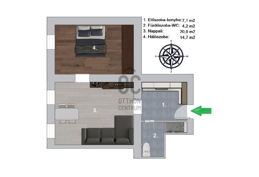 - Jelenlegi felosztása: előszoba-konyha, nappali + 1 hálószoba, zuhanyzós fürdőszoba-wc.