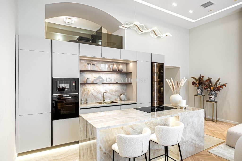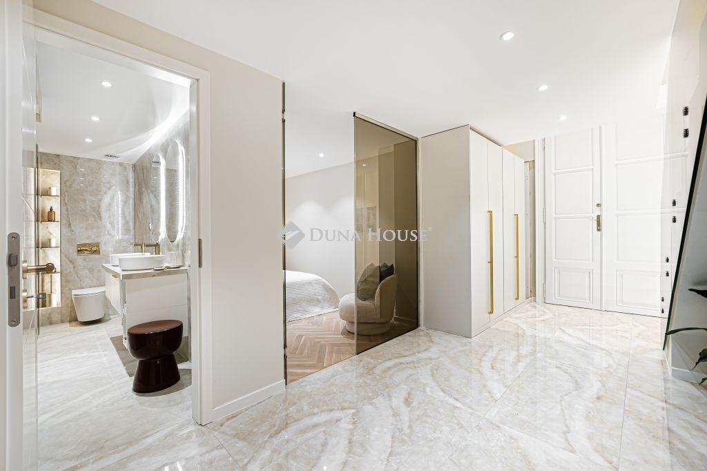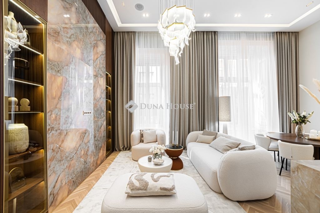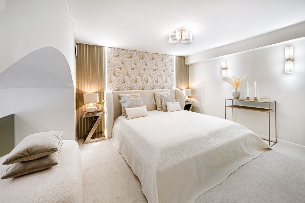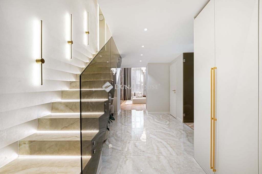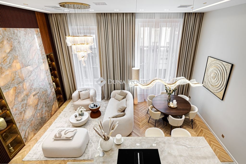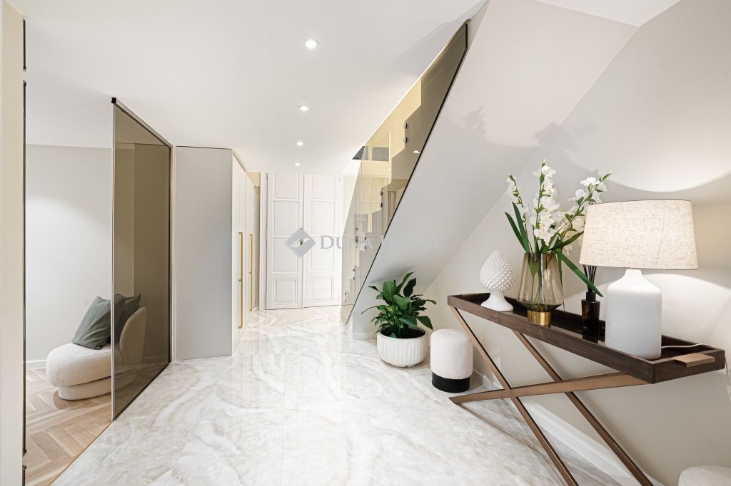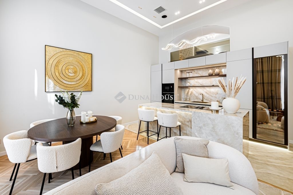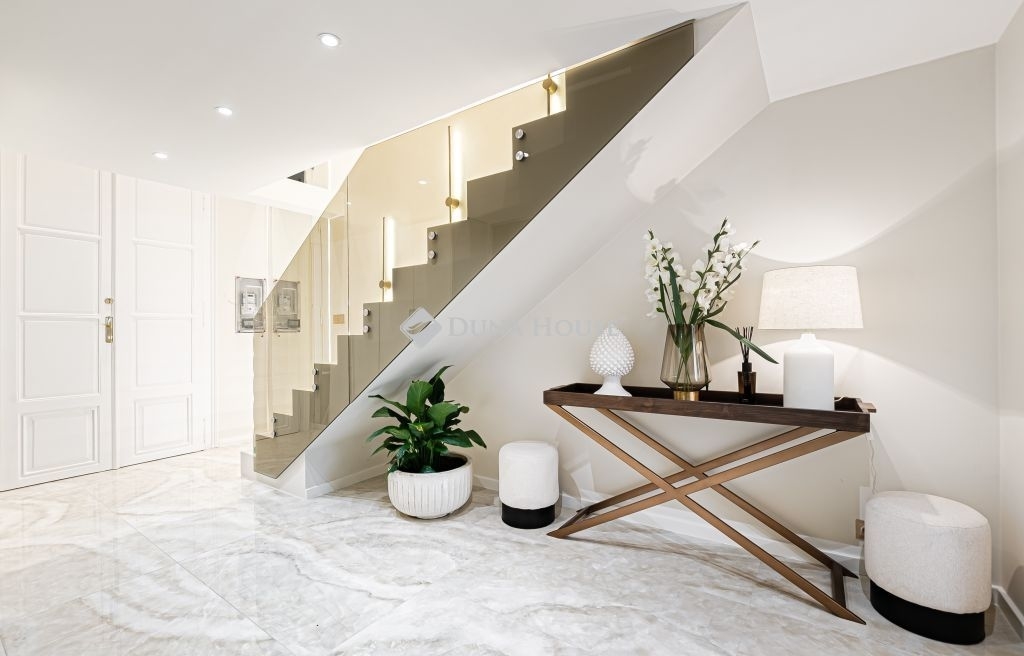 BAZILIKA MELLETT, MINDEN IGÉNYT KIELÉGÍTŐ, TELJESKÖRŰEN FELÚJÍTOTT KÉTSZINTES LUXUS LAKÁS ELADÓ!Az 5.kerület frekventált részén a Hercegprímás utcában eladóvá vált egy belső kétszintes, 105 nm-es, amerikai konyha nappalis+2 hálószobás+két fürdőszobás, napfényes, kiváló kivitelezésben felújított, utcára néző, minden igényt kielégítő elegáns luxus lakás, amely egy rendezett, szép állapotú Társasház első szintjén található.A belsőépítészek nagy hangsúlyt fektettek a minél praktikusabb elrendezésre, ezzel is minél jobban kihasználva a lakás adottságait. Így például az ingatlan alaprajzának és a rendkívül nagy belmagasságnak (465cm) köszönhetően került kialakításra a (74nm-es) földszinten a nappali +amerikai konyha, világítással ellátott, kerámiával burkolt konyhasziget, egy hálószoba és egy zuhanyzós fürdőszoba ill. egy tágas előszoba, ahol egy beépített szekrény került beépítésre rengeteg rakodófelülettel. A (31 nm-es) emeletén kialakításra került egy tágas hálószoba saját intim fürdőszobával és egy folyosó, ahol egy egyedi vitrines világítással ellátott beépített szekrény került beépítésre.A belső kétszintes lakás, emelet alatti belmagassága 225 cm, az emeleti rész belmagassága 220 cm, a két szint között 20 cm vastag vasbeton födém lett kiépítve. A szintek között a beton lépcső kő lappal burkolt. A berendezést és a dekorációkat a 2025 év a legújabb divat trendek szerint a letisztult formák és az otthonosság érzését kiváltó pasztelltónusok jellemzik, amelyek modern, elegáns összképet adnak, kerülve a zsúfoltságot. A lakásban egyedi olasz díszítőfelületek, antikolt falfelületek, a nappaliban a tv fal egyedisége, különböző vitrinek, faldekorok, a hálószobákban az ágyak mögött Robelto Cavalli tapéták, különböző világítástechnika, led világítások, Olasz-Spanyol design meleg diófa bútorok használata teszik még izgalmasabbá az enteriőrt. A különleges mintázatú burkolatok, a hálószobákban a parketta, díszítőfelületek, textilek és egyéb kiegészítő elemek is kellő eleganciával párosulnak.MŰSZAKI-EXTRÁK:-Padlófűtés lett kiépítve, energia takarékos gáz kazán biztosítja a fűtést és a meleg vizet.-Rejtett szellőzés, rejtett hűtő-fűtő klíma (külön vezérelhető a földszinten és az emeleten)-Energia takarékos, különböző módon variálható világítás.-Mennyezetben beépített -bluetooth-al vezérelhető-hangosítás-Burkolatfa parketta ill. onix nagy lap burkolatok.-Teljeskörűen gépesített olasz konyha, konyhasziget bár résszel-Onix burkolatú média fal- led világítással ellátott vitrines polc-Olasz,spanyol márkás bútorokkal teljeskörűen berendezett lakás-Hő és hangszigetelt nyílászárók-gyönyörű restaurált spalettákLokáció szempontjából az ingatlan elhelyezkedése kiváló, Bazilika karnyújtásnyira található, elegáns éttermek különböző nevezetességek veszik körül.Amennyiben a belvárosban kényelmes, modern, stílusos, elegáns, luxus otthont keres saját vagy befektetési célból, kérem forduljon hozzám bizalommal!NEXT TO THE BASILICA, A COMPLETELY RENOVATED TWO-LEVEL LUXURY APARTMENT THAT SATISFS ALL NEEDS IS FOR SALE!In the busy part of the 5th district, on Hercegprímás Street, an elegant two-level luxury apartment with a sunny interior, renovated in a luxurious design, facing the street, satisfying all needs, is for sale. It is located on the first floor of a tidy, well-maintained condominium.The interior designers placed great emphasis on the most practical layout, thus making the most of the apartments features. For example, thanks to the floor plan of the property and the extremely high ceiling height (465cm), the ground floor (74sqm) was designed with a living room + American kitchen, a kitchen island with lighting, tiled with ceramics, a bedroom and a bathroom with shower, as well as a spacious hall, where a built-in wardrobe with plenty of storage space was installed. On the (31 sqm) floor, a spacious bedroom with its own intimate bathroom and a corridor were created, where a built-in wardrobe with unique display lighting was installed.The interior of the two-story apartment has a ceiling height of 225 cm below the floor, and a ceiling height of 220 cm above the floor. A 20 cm thick reinforced concrete slab was built between the two floors. The concrete staircase between the floors is covered with stone slabs.The furnishings and decorations are characterized by clean shapes and pastel tones that evoke a feeling of coziness according to the latest fashion trends of 2025, which give a modern, elegant overall picture, avoiding crowding. The apartment features unique Italian decorative surfaces, antiqued wall surfaces, the uniqueness of the TV wall in the living room, various display cases, wall decorations, Robelto Cavalli wallpapers behind the beds in the bedrooms, various lighting technology, LED lighting, the use of Italian-Spanish design warm walnut furniture make the interior even more exciting. The special patterned coverings, the parquet in the bedrooms, decorative surfaces, textiles and other additional elements are also combined with sufficient elegance.TECHNICAL EXTRAS:-Underfloor heating has been installed, an energy-saving gas boiler provides heating and hot water.-Hidden ventilation, hidden cooling-heating air conditioning (can be controlled separately on the ground floor and upstairs)-Energy-saving, variable lighting in different ways.-Built-in ceiling-controlled sound system-Wooden parquet or onyx large-slab coverings.-Fully mechanized Italian kitchen, kitchen island with bar area-Onix-covered media wall- glass shelf with LED lighting-Fully furnished apartment with Italian and Spanish branded furniture-Heat and sound-insulated windows-beautiful restored shuttersIn terms of location, the 