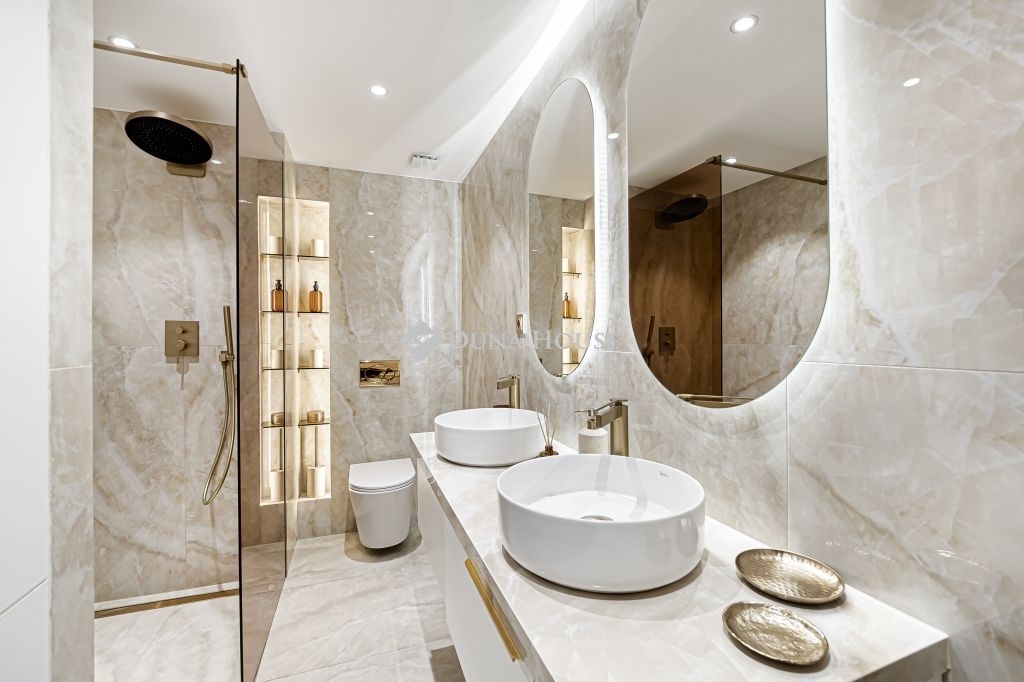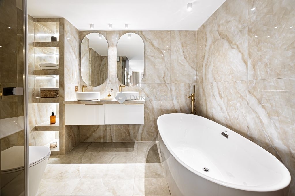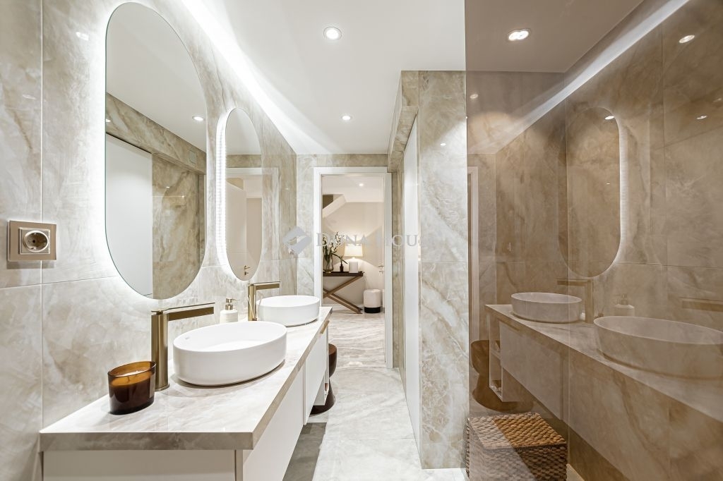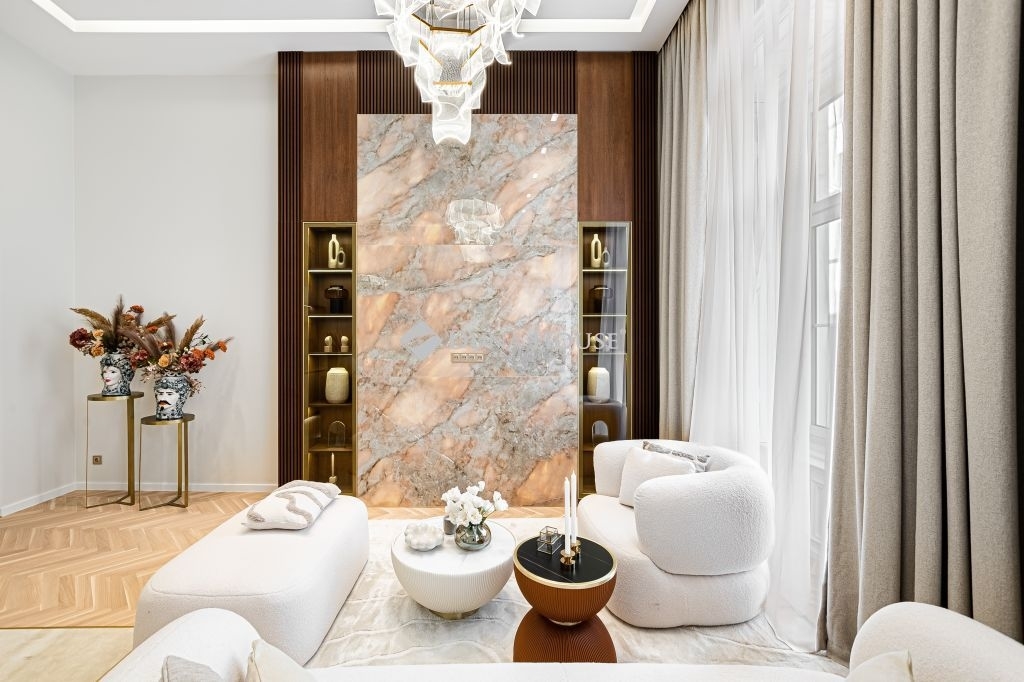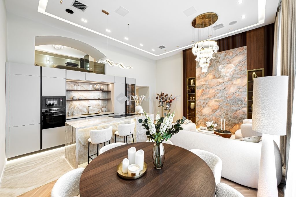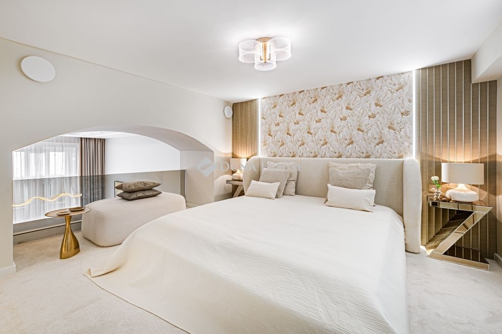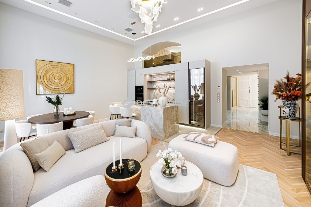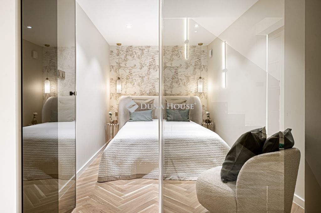 BAZILIKA MELLETT, MINDEN IGÉNYT KIELÉGÍTŐ, TELJESKÖRŰEN FELÚJÍTOTT KÉTSZINTES LUXUS LAKÁS ELADÓ!Az 5.kerület frekventált részén a Hercegprímás utcában eladóvá vált egy belső kétszintes, 105 nm-es, amerikai konyha nappalis+2 hálószobás+két fürdőszobás, napfényes, kiváló kivitelezésben felújított, utcára néző, minden igényt kielégítő elegáns luxus lakás, amely egy rendezett, szép állapotú Társasház első szintjén található.A belsőépítészek nagy hangsúlyt fektettek a minél praktikusabb elrendezésre, ezzel is minél jobban kihasználva a lakás adottságait. Így például az ingatlan alaprajzának és a rendkívül nagy belmagasságnak (465cm) köszönhetően került kialakításra a (74nm-es) földszinten a nappali +amerikai konyha, világítással ellátott, kerámiával burkolt konyhasziget, egy hálószoba és egy zuhanyzós fürdőszoba ill. egy tágas előszoba, ahol egy beépített szekrény került beépítésre rengeteg rakodófelülettel. A (31 nm-es) emeletén kialakításra került egy tágas hálószoba saját intim fürdőszobával és egy folyosó, ahol egy egyedi vitrines világítással ellátott beépített szekrény került beépítésre.A belső kétszintes lakás, emelet alatti belmagassága 225 cm, az emeleti rész belmagassága 220 cm, a két szint között 20 cm vastag vasbeton födém lett kiépítve. A szintek között a beton lépcső kő lappal burkolt. A berendezést és a dekorációkat a 2025 év a legújabb divat trendek szerint a letisztult formák és az otthonosság érzését kiváltó pasztelltónusok jellemzik, amelyek modern, elegáns összképet adnak, kerülve a zsúfoltságot. A lakásban egyedi olasz díszítőfelületek, antikolt falfelületek, a nappaliban a tv fal egyedisége, különböző vitrinek, faldekorok, a hálószobákban az ágyak mögött Robelto Cavalli tapéták, különböző világítástechnika, led világítások, Olasz-Spanyol design meleg diófa bútorok használata teszik még izgalmasabbá az enteriőrt. A különleges mintázatú burkolatok, a hálószobákban a parketta, díszítőfelületek, textilek és egyéb kiegészítő elemek is kellő eleganciával párosulnak.MŰSZAKI-EXTRÁK:-Padlófűtés lett kiépítve, energia takarékos gáz kazán biztosítja a fűtést és a meleg vizet.-Rejtett szellőzés, rejtett hűtő-fűtő klíma (külön vezérelhető a földszinten és az emeleten)-Energia takarékos, különböző módon variálható világítás.-Mennyezetben beépített -bluetooth-al vezérelhető-hangosítás-Burkolatfa parketta ill. onix nagy lap burkolatok.-Teljeskörűen gépesített olasz konyha, konyhasziget bár résszel-Onix burkolatú média fal- led világítással ellátott vitrines polc-Olasz,spanyol márkás bútorokkal teljeskörűen berendezett lakás-Hő és hangszigetelt nyílászárók-gyönyörű restaurált spalettákLokáció szempontjából az ingatlan elhelyezkedése kiváló, Bazilika karnyújtásnyira található, elegáns éttermek különböző nevezetességek veszik körül.Amennyiben a belvárosban kényelmes, modern, stílusos, elegáns, luxus otthont keres saját vagy befektetési célból, kérem forduljon hozzám bizalommal!NEXT TO THE BASILICA, A COMPLETELY RENOVATED TWO-LEVEL LUXURY APARTMENT THAT SATISFS ALL NEEDS IS FOR SALE!In the busy part of the 5th district, on Hercegprímás Street, an elegant two-level luxury apartment with a sunny interior, renovated in a luxurious design, facing the street, satisfying all needs, is for sale. It is located on the first floor of a tidy, well-maintained condominium.The interior designers placed great emphasis on the most practical layout, thus making the most of the apartments features. For example, thanks to the floor plan of the property and the extremely high ceiling height (465cm), the ground floor (74sqm) was designed with a living room + American kitchen, a kitchen island with lighting, tiled with ceramics, a bedroom and a bathroom with shower, as well as a spacious hall, where a built-in wardrobe with plenty of storage space was installed. On the (31 sqm) floor, a spacious bedroom with its own intimate bathroom and a corridor were created, where a built-in wardrobe with unique display lighting was installed.The interior of the two-story apartment has a ceiling height of 225 cm below the floor, and a ceiling height of 220 cm above the floor. A 20 cm thick reinforced concrete slab was built between the two floors. The concrete staircase between the floors is covered with stone slabs.The furnishings and decorations are characterized by clean shapes and pastel tones that evoke a feeling of coziness according to the latest fashion trends of 2025, which give a modern, elegant overall picture, avoiding crowding. The apartment features unique Italian decorative surfaces, antiqued wall surfaces, the uniqueness of the TV wall in the living room, various display cases, wall decorations, Robelto Cavalli wallpapers behind the beds in the bedrooms, various lighting technology, LED lighting, the use of Italian-Spanish design warm walnut furniture make the interior even more exciting. The special patterned coverings, the parquet in the bedrooms, decorative surfaces, textiles and other additional elements are also combined with sufficient elegance.TECHNICAL EXTRAS:-Underfloor heating has been installed, an energy-saving gas boiler provides heating and hot water.-Hidden ventilation, hidden cooling-heating air conditioning (can be controlled separately on the ground floor and upstairs)-Energy-saving, variable lighting in different ways.-Built-in ceiling-controlled sound system-Wooden parquet or onyx large-slab coverings.-Fully mechanized Italian kitchen, kitchen island with bar area-Onix-covered media wall- glass shelf with LED lighting-Fully furnished apartment with Italian and Spanish branded furniture-Heat and sound-insulated windows-beautiful restored shuttersIn terms of location, the 