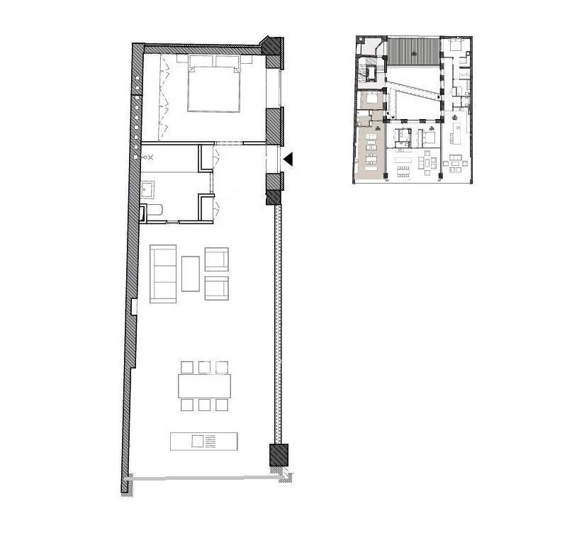 The apartment offers generous spaces, high ceilings, and an industrial design. It overlooks both Múzeum körút and the inner courtyard, and features a terrace with panoramic views of Gellért Hill.