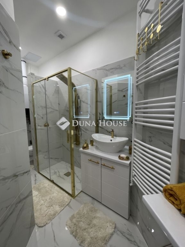 A lakás minden részletében minőségi anyagokkal és ízléses, modern stílusban került kialakításra. A világos, fehér-arany színvilág, a rejtett világítás és a letisztult bútorzat elegáns, mégis barátságos hangulatot biztosít.