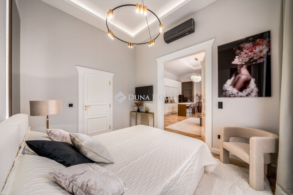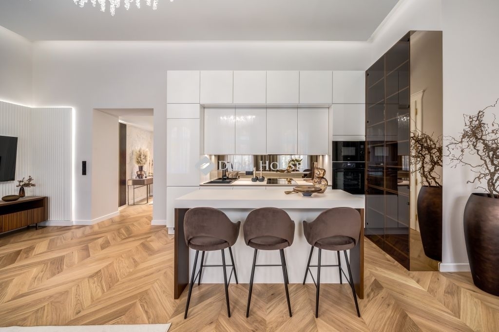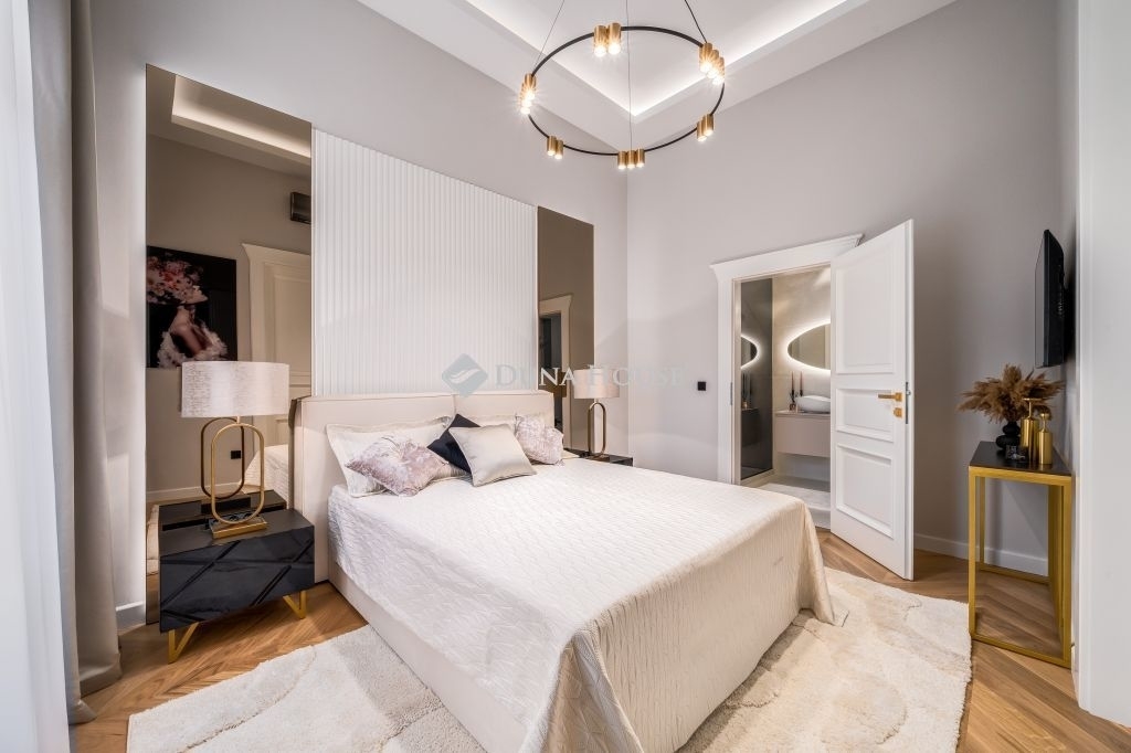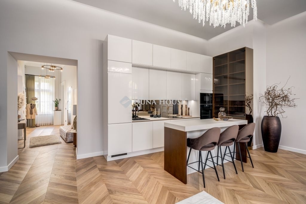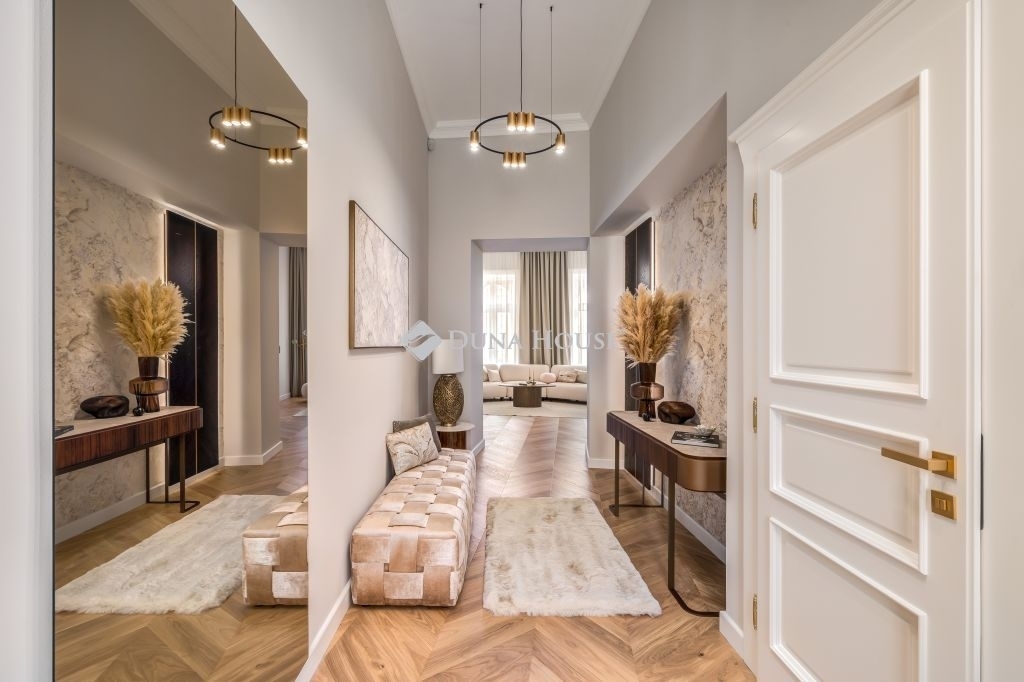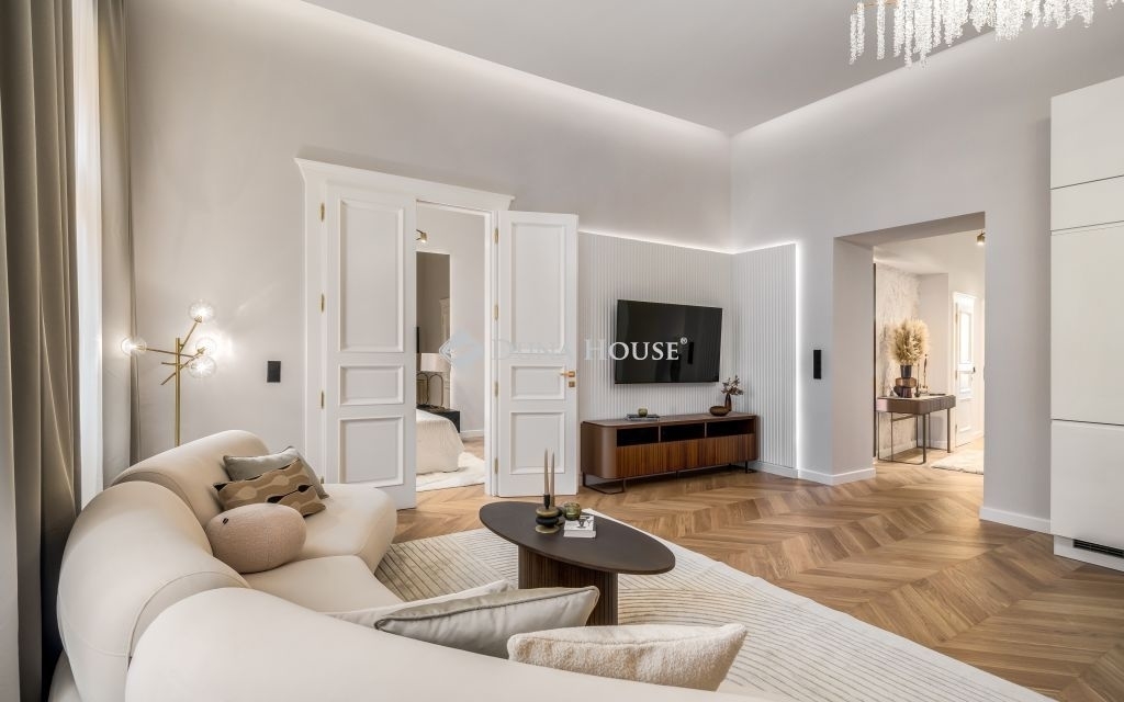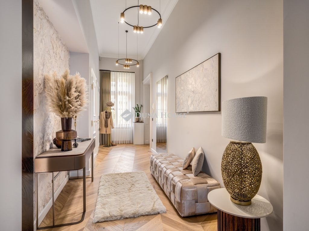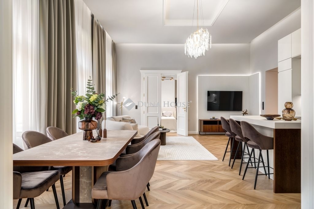 In the frequented part of the 5th district, this elegant luxury apartment of 130 m2, with a balcony, sunny, luxuriously renovated, facing the street, satisfying all needs, is for sale. It is located on the first floor of an orderly, well-maintained condominium.