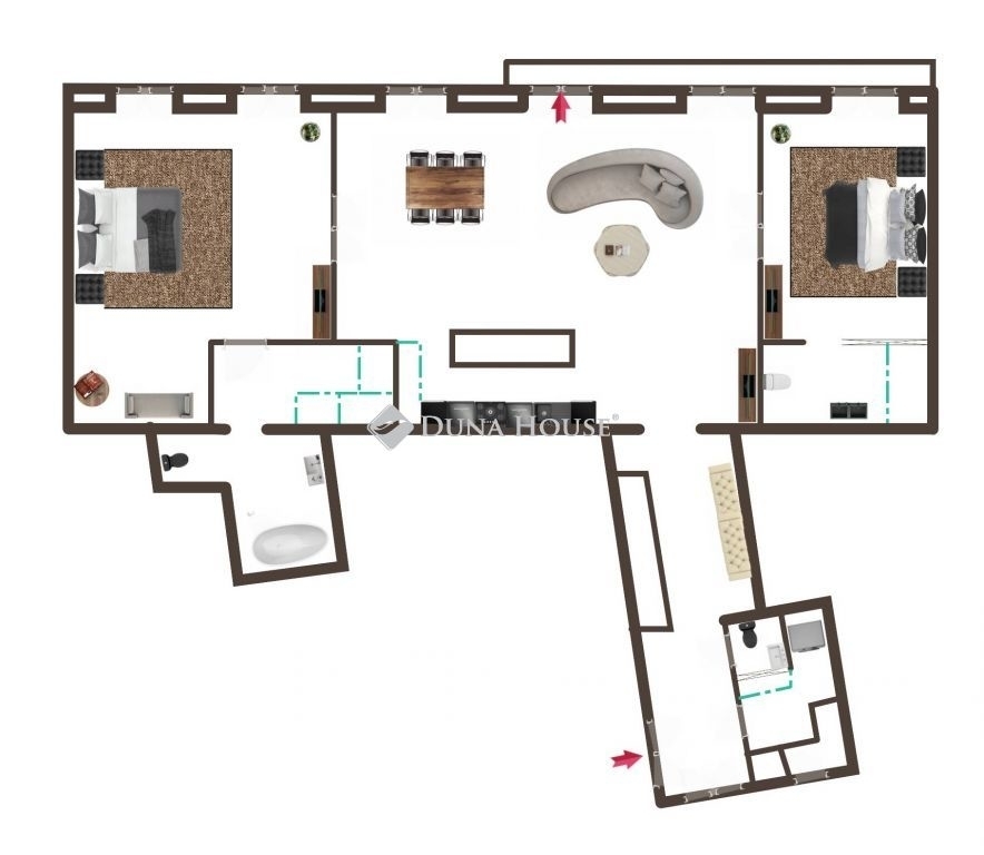 A belsőépítészek nagy hangsúlyt fektettek a minél praktikusabb elrendezésre, ezzel is minél jobban kihasználva a lakás alaprajzi adottságait. Így került kialakításra 2 külön bejáratú hálószoba, 2 gardróbszoba, 2 fürdőszoba, 3wc, tágas nappali amerikai-konyha konyhaszigettel, étkezővel és egy tágas ablakos előszoba.