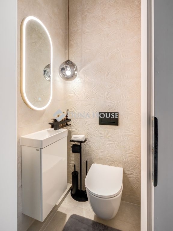 The decorative walls of the bedrooms were covered with slats and one of the most elegant wall panels of the year 2025, whose elegant surfaces give the space a special effect. Beds have been given individually designed upholstery headboards, behind which LED lighting makes the rooms as cozy as possible. The bathrooms have high-quality sanitary ware (Laufren, Villeroy&, Rokka, Deluzzo) and Italian design coverings (Marazzi) matching the style of the apartment. In the living room and bedrooms, electric awnings, blackout curtains, and cooling and heating air conditioners have been installed. Decorations by well-known designers (Kare, Art deco, Trusardi, IDdezing, Bo Concept, Einholtz, etc.) give the apartment a truly modern and elegant atmosphere.