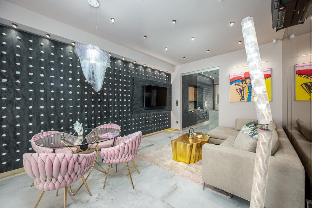 -elegáns nappali-étkező, mely a lakás központi tere,
