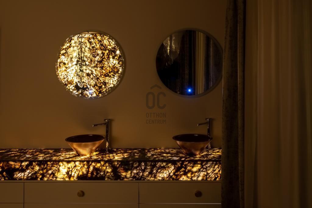 - Resopal arany dekor mosdószekrény Naica kvarcit pulttal