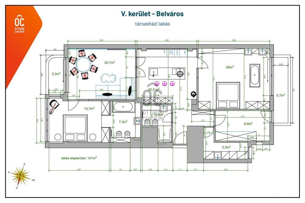 A 121 m²-es, világos, keleti tájolású lakás kifinomult eleganciát és modern kényelmet ötvöz.
