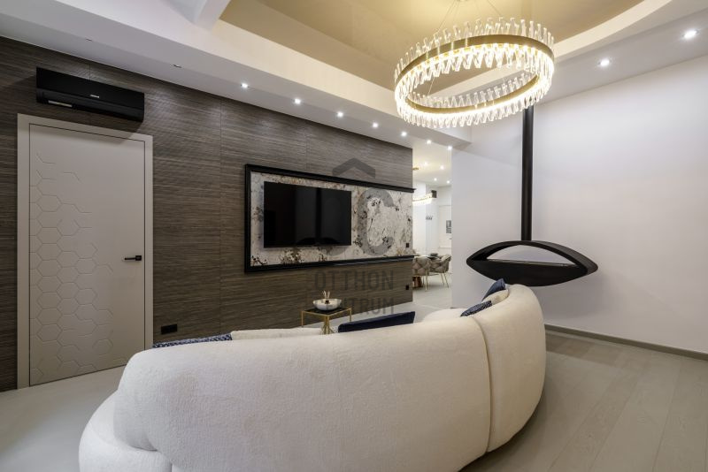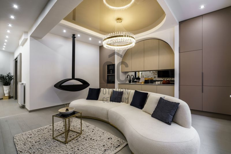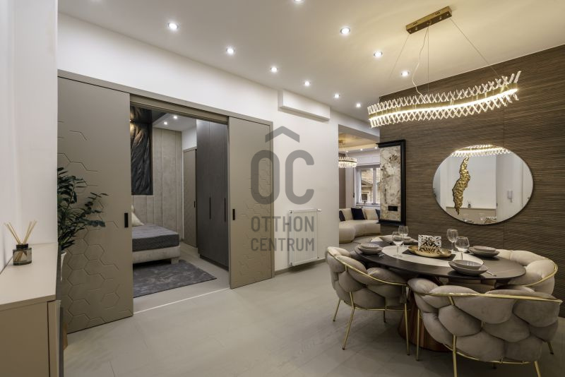 A délnyugati tájolású, világos, amerikai konyhás nappali látványkandallóval és design bútorokkal berendezett tér tökéletes otthon vagy befektetés.