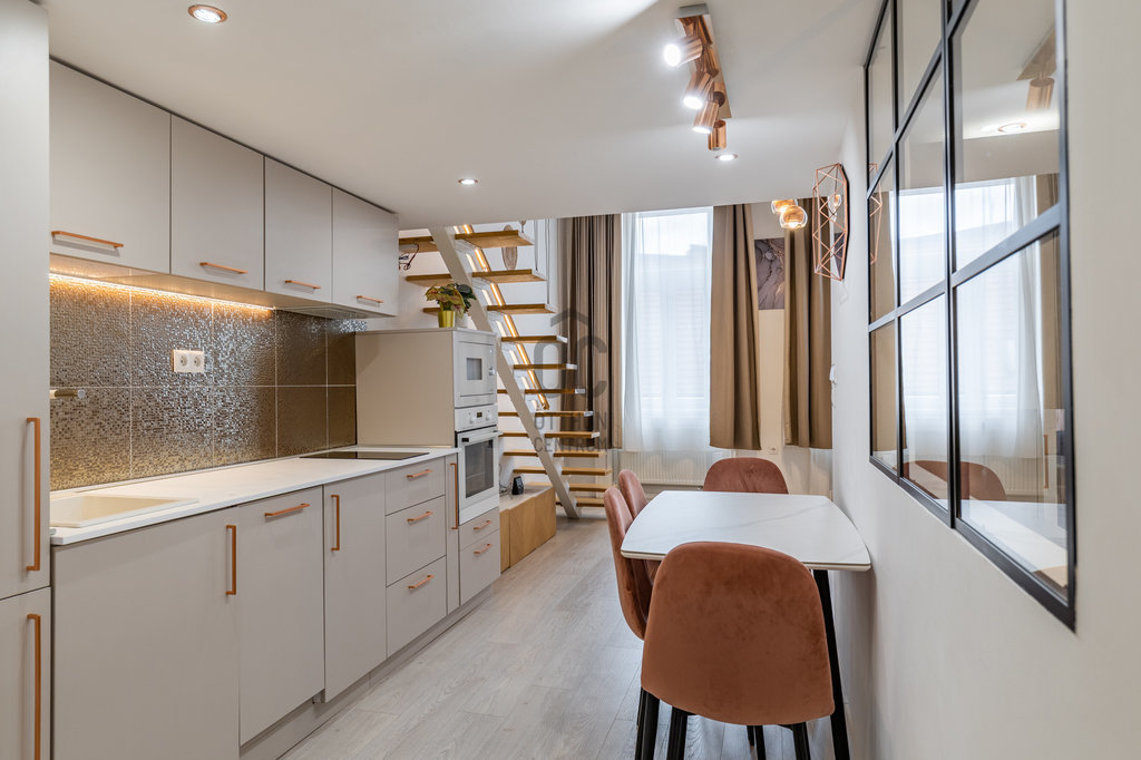 A Magyar utca hangulatos részén, egy 19. századi, liftes polgári ház harmadik emeletén található ez a 44 m²-es, galériás, igényesen felújított lakás. A kisebb alapterület ellenére a tér átgondolt szervezése, a jó belmagasság és a nappali-galéria ritmusa kifejezetten élhető, szerethető atmoszférát hoz létre — akár saját használatra, akár befektetésként is stabil választás.