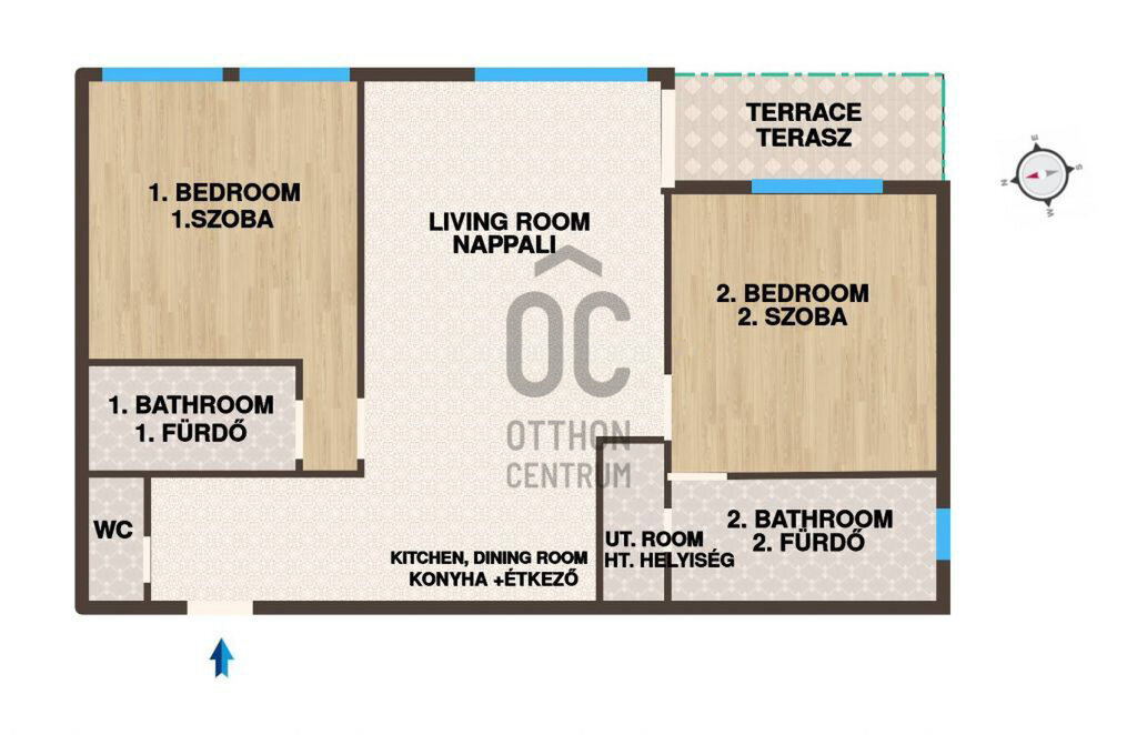 Elosztása kiváló. Hatalmas, amerikai konyhás, étkezős nappali, és két hálószoba található benne, melyekhez 1-1 privát fürdőszoba tartozik.