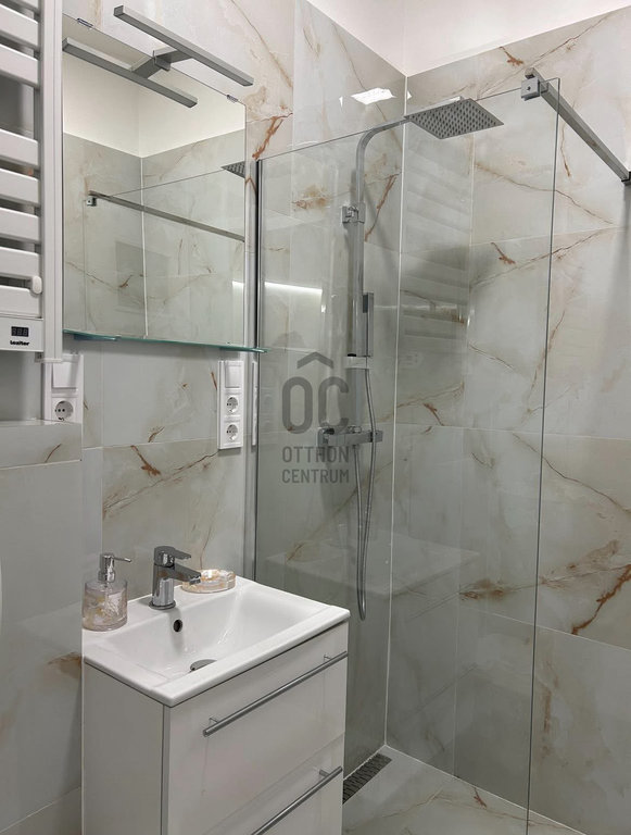 modern szaniterek: épített zuhany, esőztetős zuhanyrendszer, falon belüli WC, lebegő mosdószekrény, Grohe csaptelepek