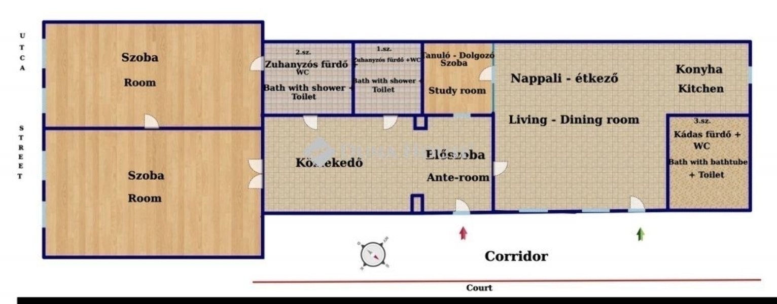 A lakáshoz 3 db fürdőszoba tartozik, 2 db zuhanyzós, 1 pedig káddal felszerelt. Az ingatlan 2022-ben teljeskörűen felújításra került, (vezetékek, nyílászárók, burkolatok cseréje.) Fűtés gázcirkó, egyedi vízóra. A lakás eredetileg 2 bejárattal rendelkezik, így akár két kisebb lakásra is osztható.