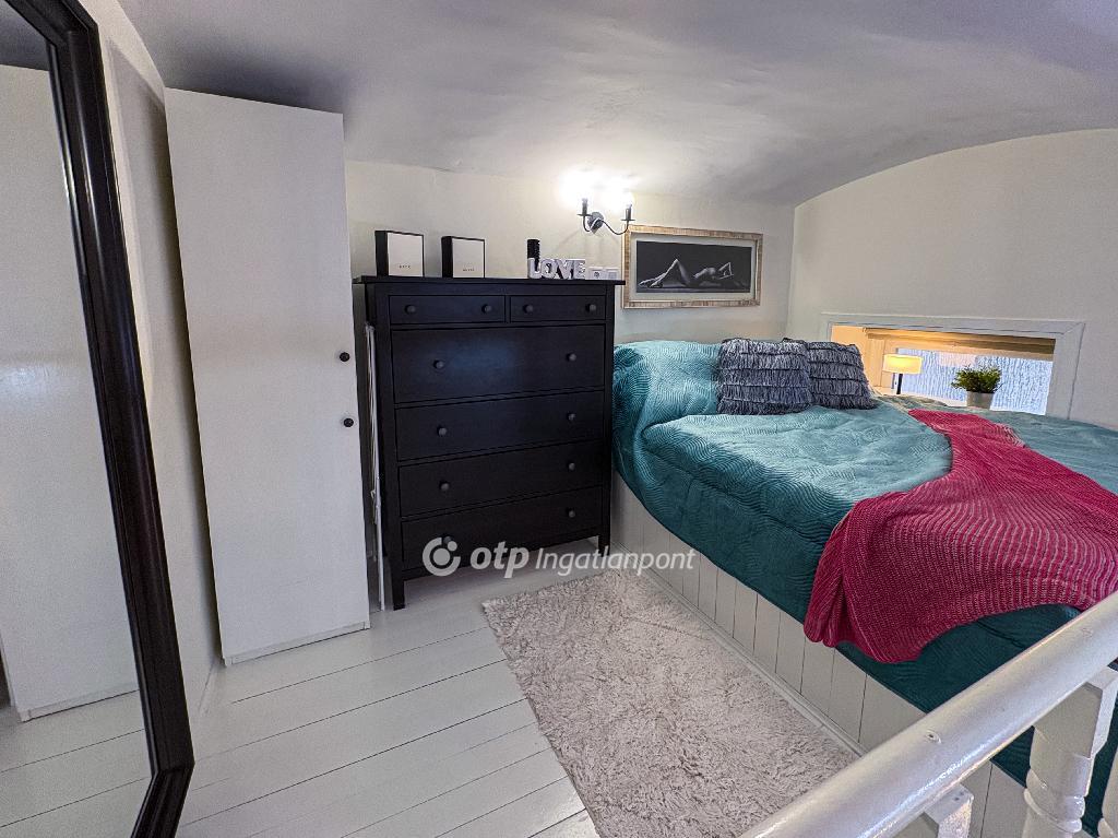 The 7 sqm mezzanine features a comfortable built-in double bed with unique exposed brick vaulting overhead. The ceiling height ranges from 180 cm at the lowest point to 193 cm at the highest.