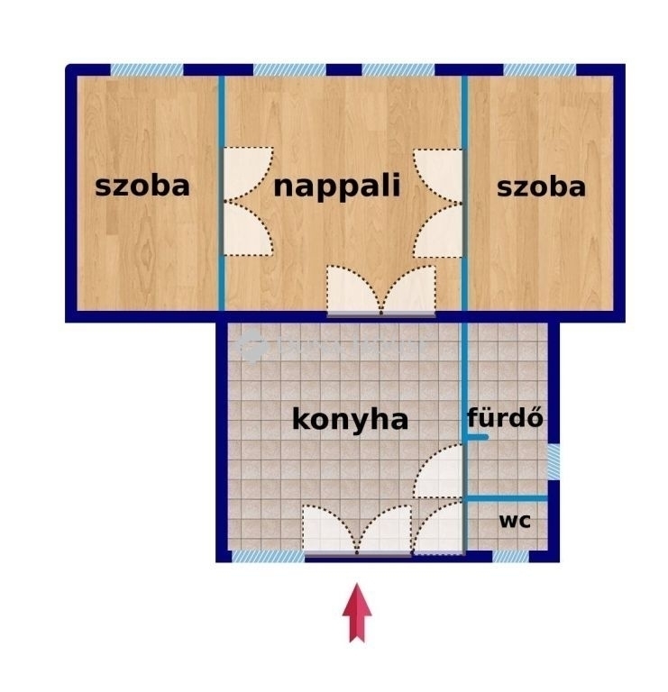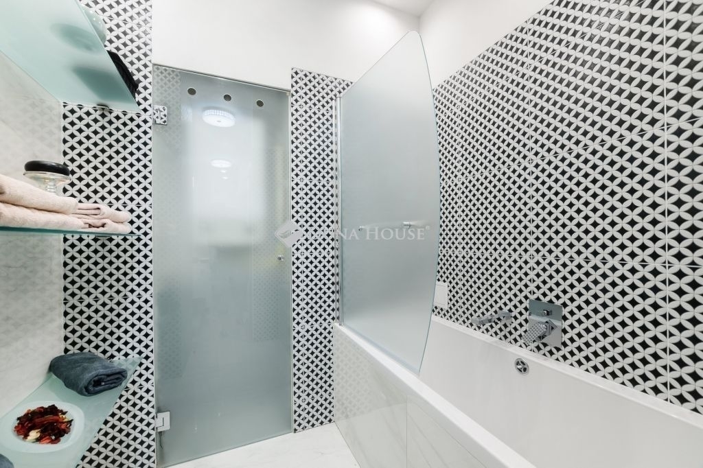Az otthon melegét egy elegáns fürdőszoba egészíti ki, mely kádas, zuhannyal és paravánnal felszerelt, továbbá egy különálló WC is rendelkezésre áll.
