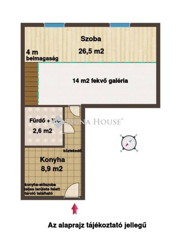 Elrendezését tekintve tágas nappali (26,5 m2), kényelmes méretű konyha/előszoba, háló galéria (14 m2), fürdőszoba és WC, tároló (~9m2) kialakítású, amely ideális első lakásvásárlók vagy befektetők részére.