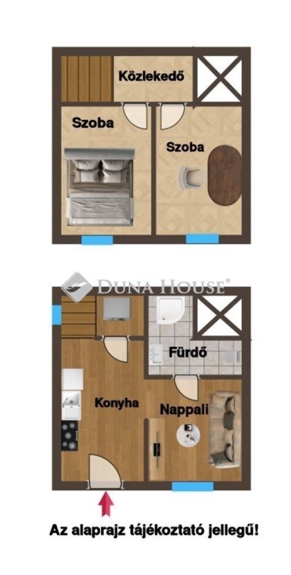Az ingatlan alapterülete 19 m², a belső kétszintes kialakításnak köszönhetően azonban a hasznos alapterület 36 m², így rendkívül praktikus és jól kihasznált elrendezésű.