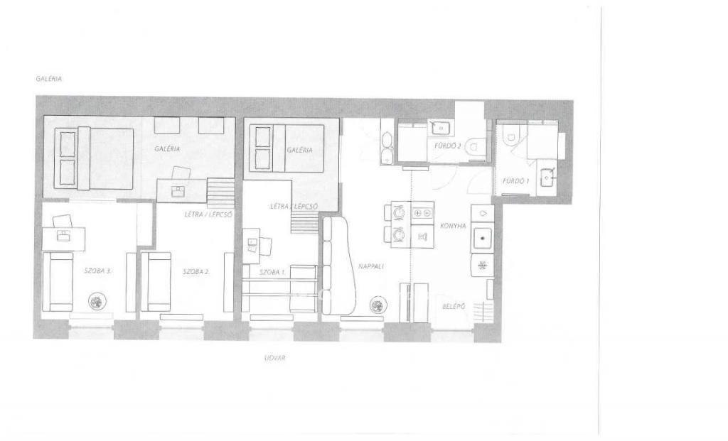 A lakás 71 nm-es, a magas belmagasság miatt galériás megoldásokkal bővítve.