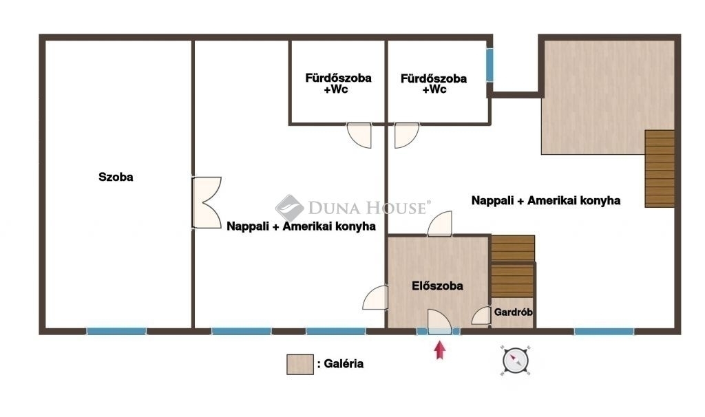 Az ingatlanban két külön is használható lakrész került kilakításra, melyek a lakás előszobájából külön bejárattal megközelíthetőek. A nagyobbik lakrészben egy amerikai konyhás nappali, egy tágas hálószoba, és egy fürdőszoba+wc helyiségek találhatóak, míg a kisebbik lakrész studió jellegű (nappali+konyha, továbbá fürdőszoba+wc), de itt két galéria is kialakításra került, melyek háló, vagy tárolóhelyként is remekül hasznosíthatóak. A helyiségek sorát az előszobából nyíló kis gardrób helyiség gyarapítja még, mely például a háztartás dolgainak tárolására optimális.
